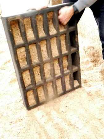 Die SANDA Sandbettwabe ist ein Systembaustein zur Erstellung einer gesunden Liegebucht. Pro Liegebox sind 4 Waben notwendig. Die Vollgummiplatte hat ein Format von 60x80x10cm mit 24 Sandnestern im Format 5,5 x 15cm pro Wabe. Das Gewicht einer Wabe liegt bei 26,5 kg. Die SANDA wird schwimmend auf den Betonboden eingelegt, an der Kotstufe ausgerichtet und anschließend mit grubenfeuchtem Schlämmsand verfüllt. Die konischen Öffnungen am Boden dienen der ggfs. Entwässerung der Liegefläche. Die SANDA hat sehr stabile, abgerundete Rasterstege und ist 100% recycelbar. Mit 1 cbm Sand kann man ca. 5 Liegebuchten befüllen. Zum Verdichten der Sandfüllung bitte keine Rüttelplatte verwenden!