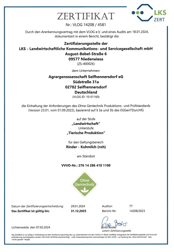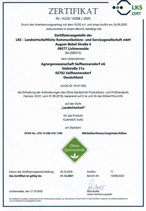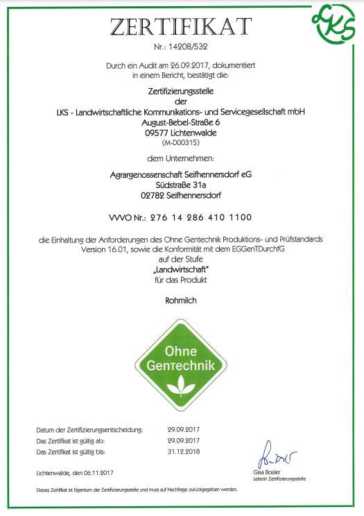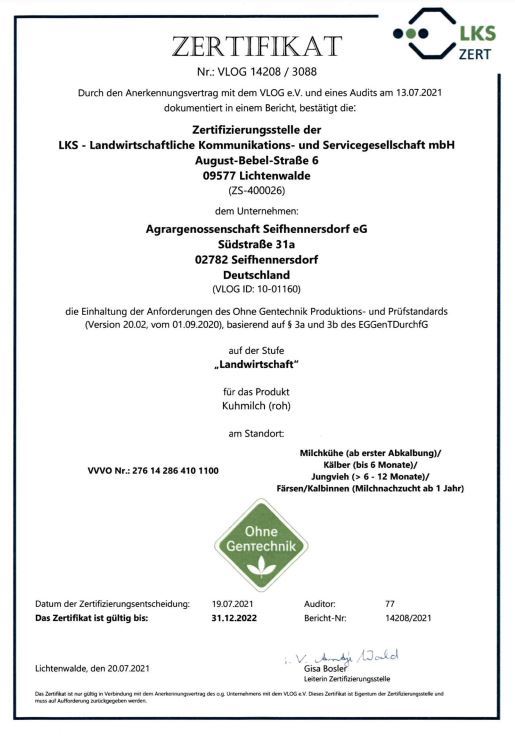 Zertifikat Genfreie Rohmilch 2021/2022 Zertifikat Genfreie Rohmilch 2020/2021