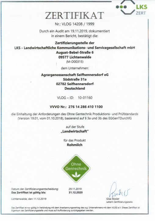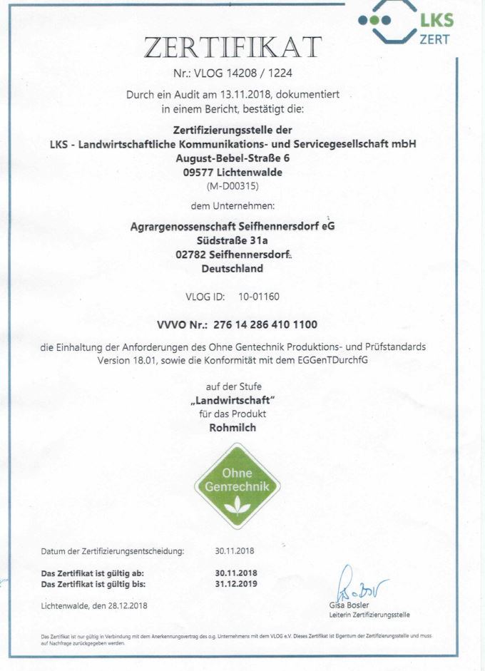 Zertifikat Genfreie Rohmilch 2019/2020 Zertifikat Genfreie Rohmilch 2018/2019